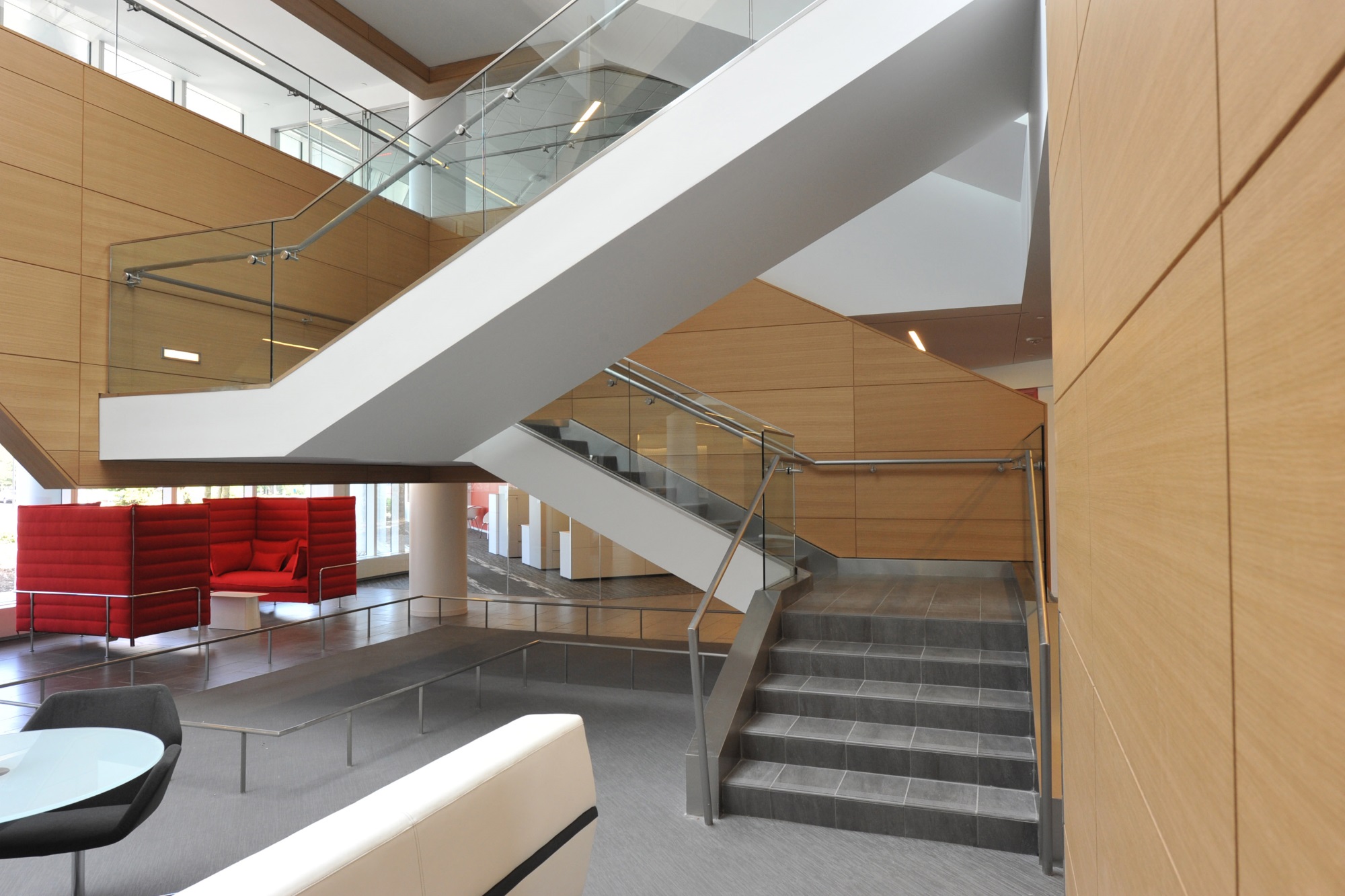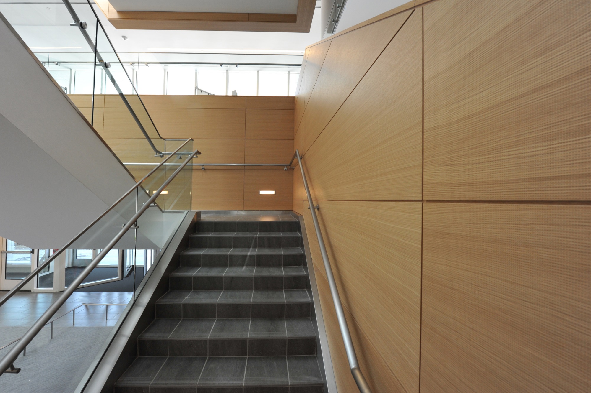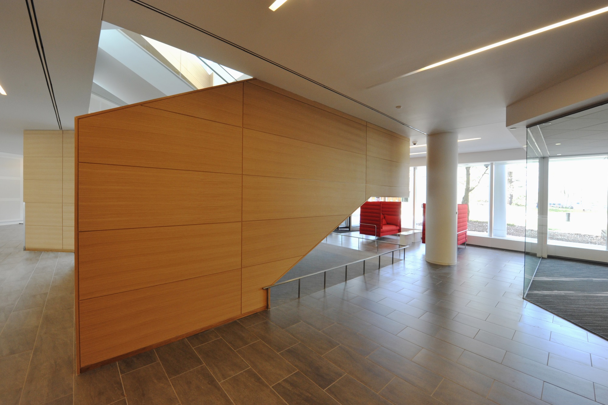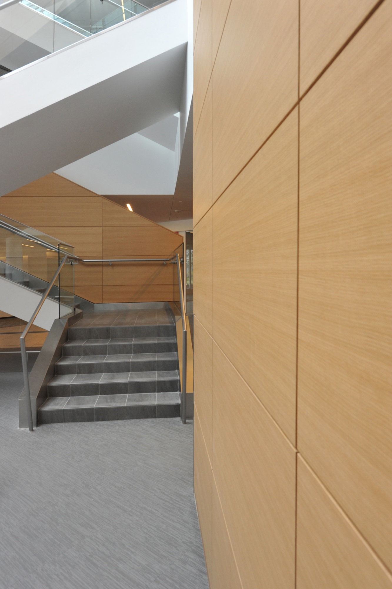 For this sophisticated new building in New Jersey, three staircases were clad with over 800 m² of AKUSTIpur wall panels. The carrier panels, made from MDF with fire protection class B-s2, d0 and formaldehyde-free adhesive, featured a veneered surface of American white oak. Given the complex shapes of these staircases, precise millimeter planning was impractical, making AKUSTIpur an ideal solution as a versatile, on-site adaptable panel. The fully microperforated panels were cut to size and finished with painted edges on-site, eliminating the need to account for unperforated edges during cutting and fastening. This approach minimized costs by avoiding factory fabrication of custom panels, reducing setup and travel requirements, and enabling a flexible, efficient, and cost-effective workflow.