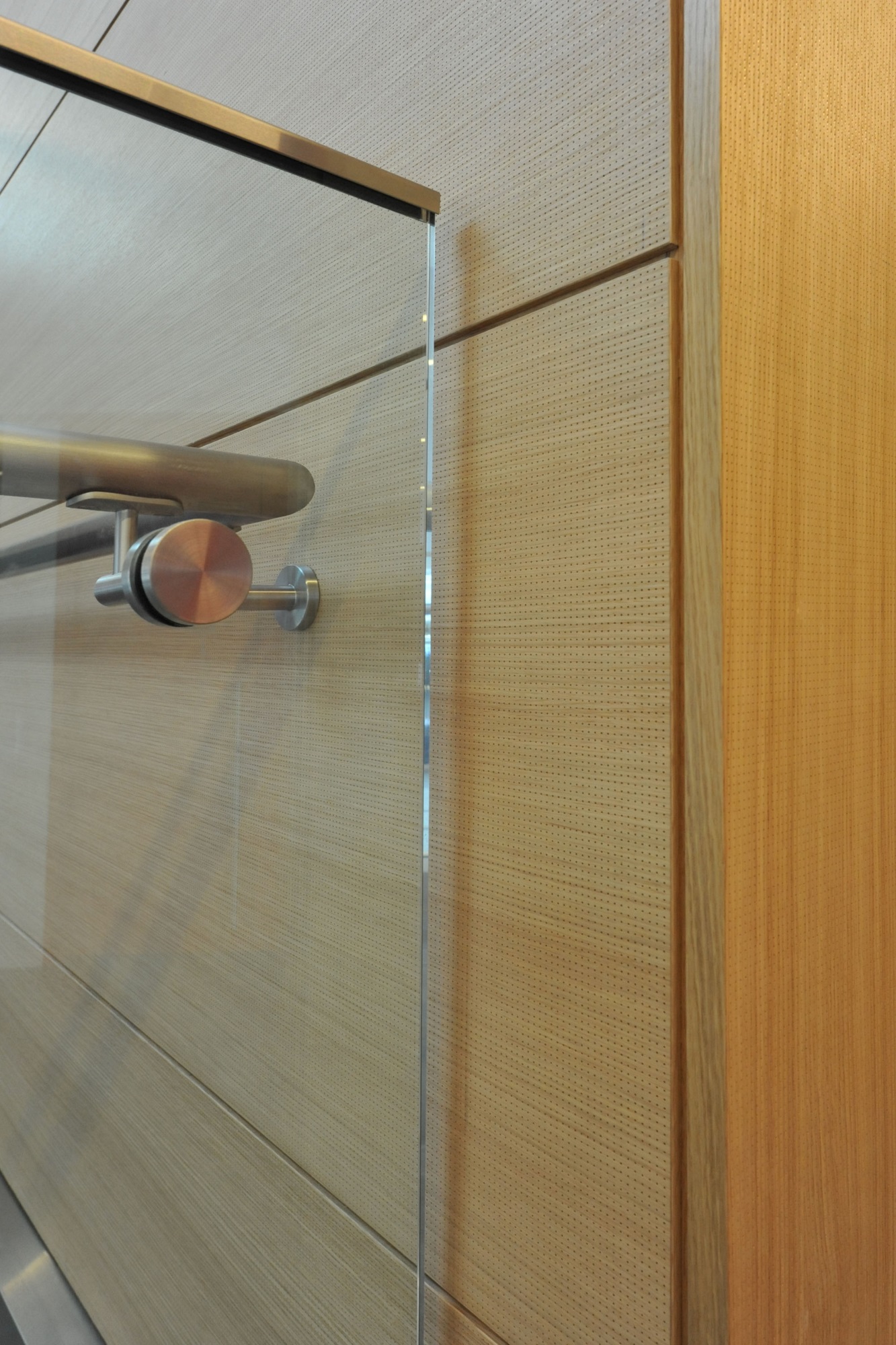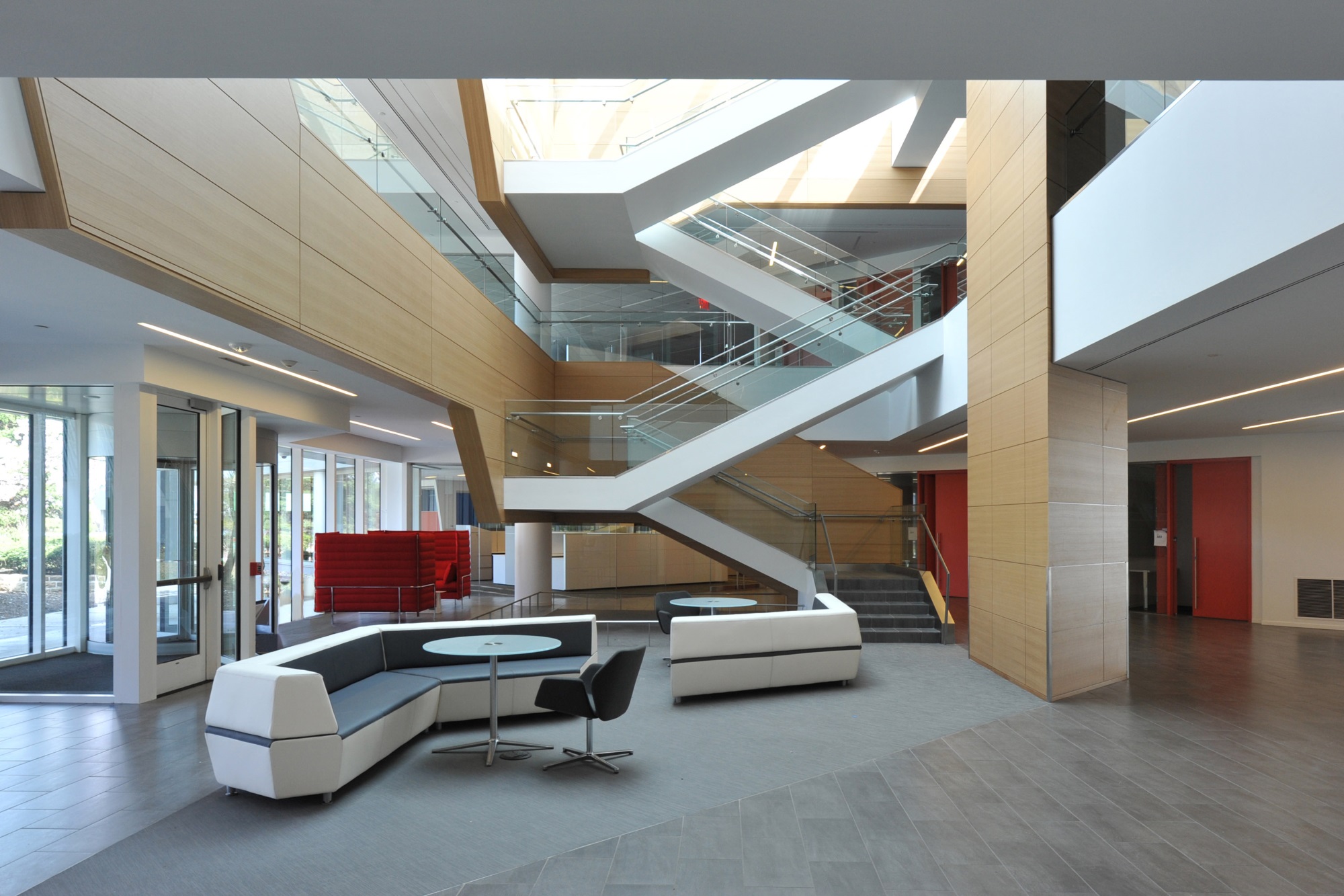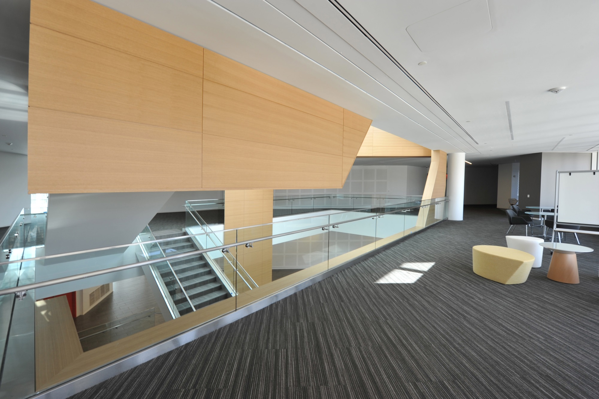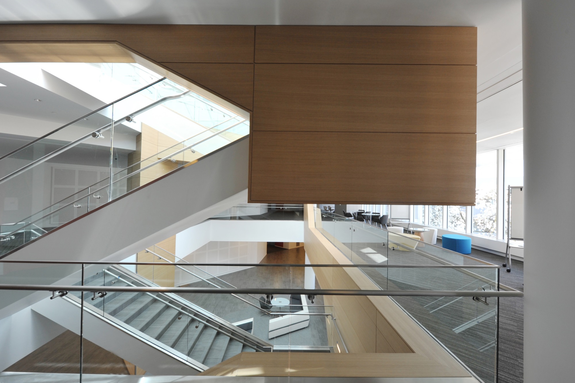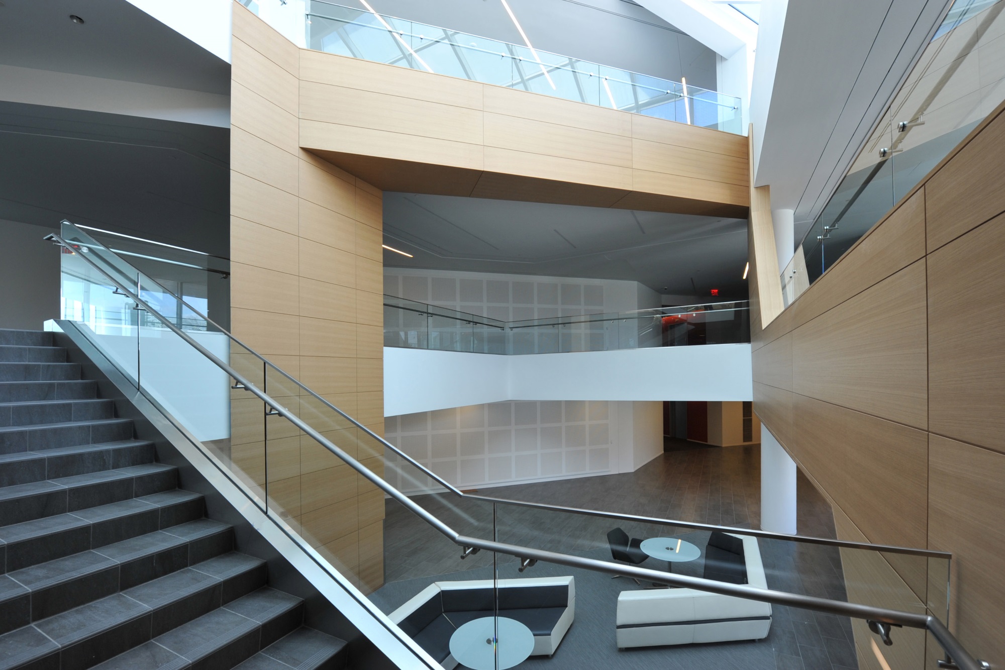 For this sophisticated new building in New Jersey, three staircases were clad with over 800 m² of AKUSTIpur wall panels. The carrier panels, made from MDF with fire protection class B-s2, d0 and formaldehyde-free adhesive, featured a veneered surface of American white oak. Given the complex shapes of these staircases, precise millimeter planning was impractical, making AKUSTIpur an ideal solution as a versatile, on-site adaptable panel. The fully microperforated panels were cut to size and finished with painted edges on-site, eliminating the need to account for unperforated edges during cutting and fastening. This approach minimized costs by avoiding factory fabrication of custom panels, reducing setup and travel requirements, and enabling a flexible, efficient, and cost-effective workflow.