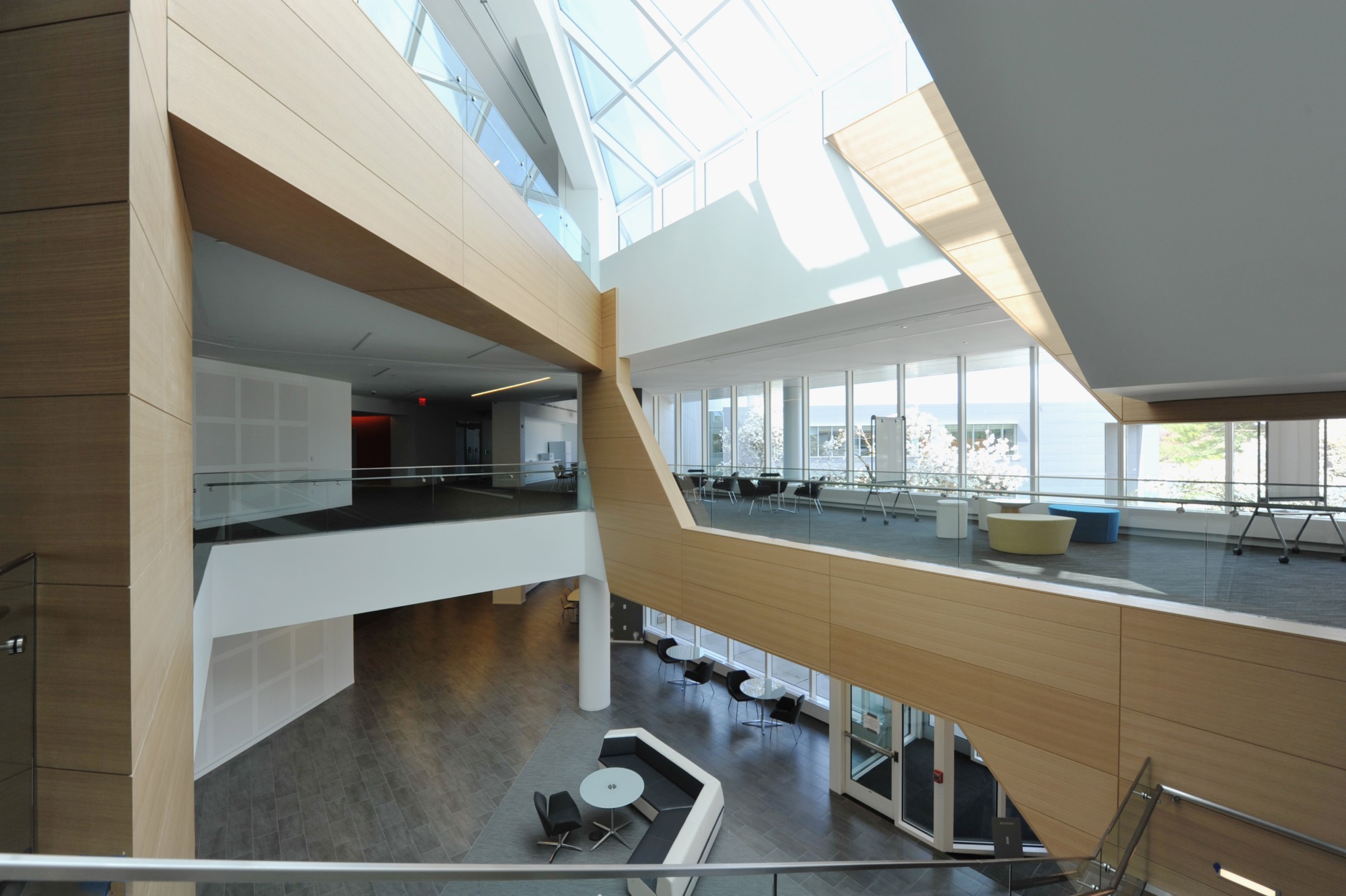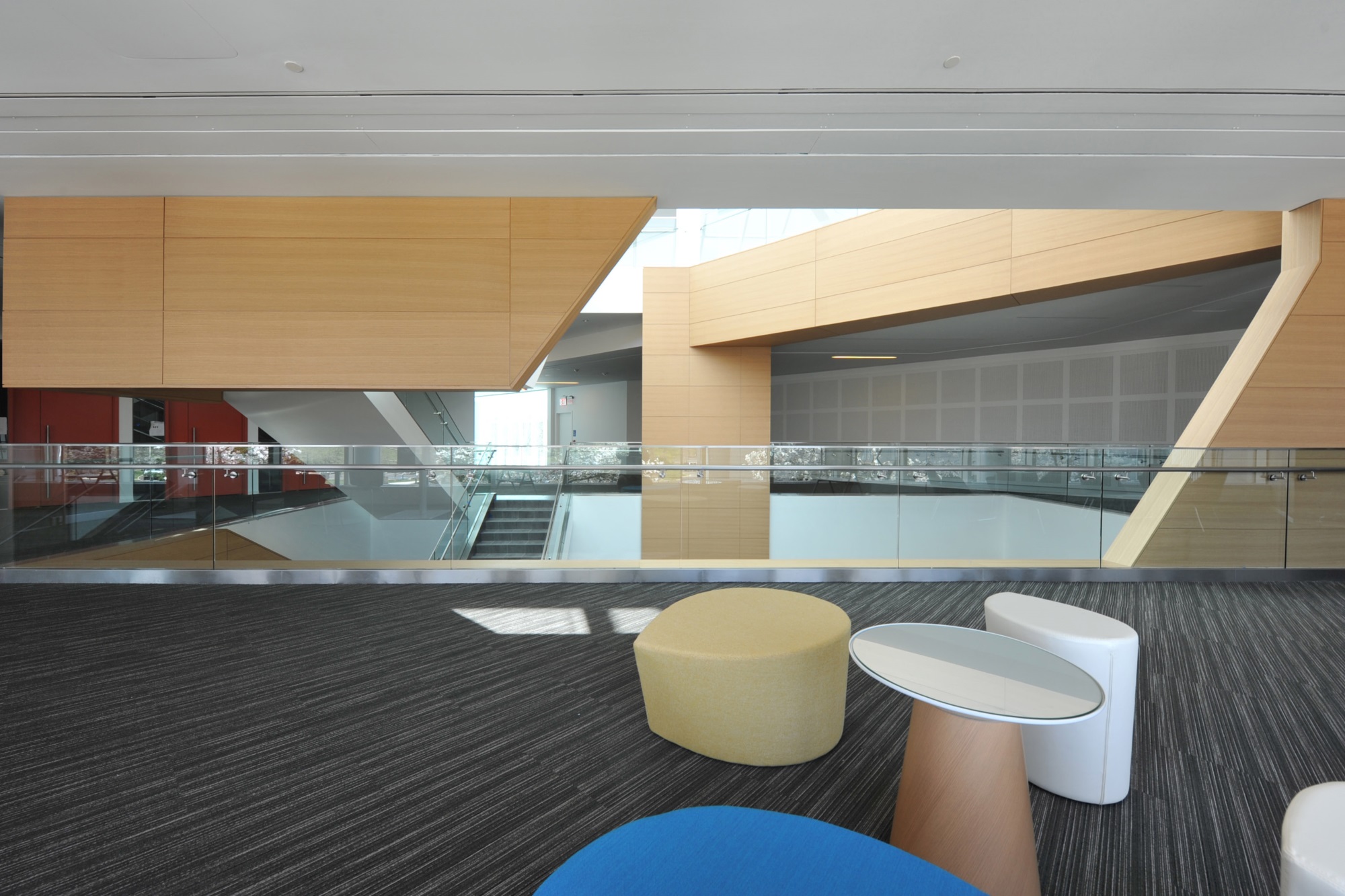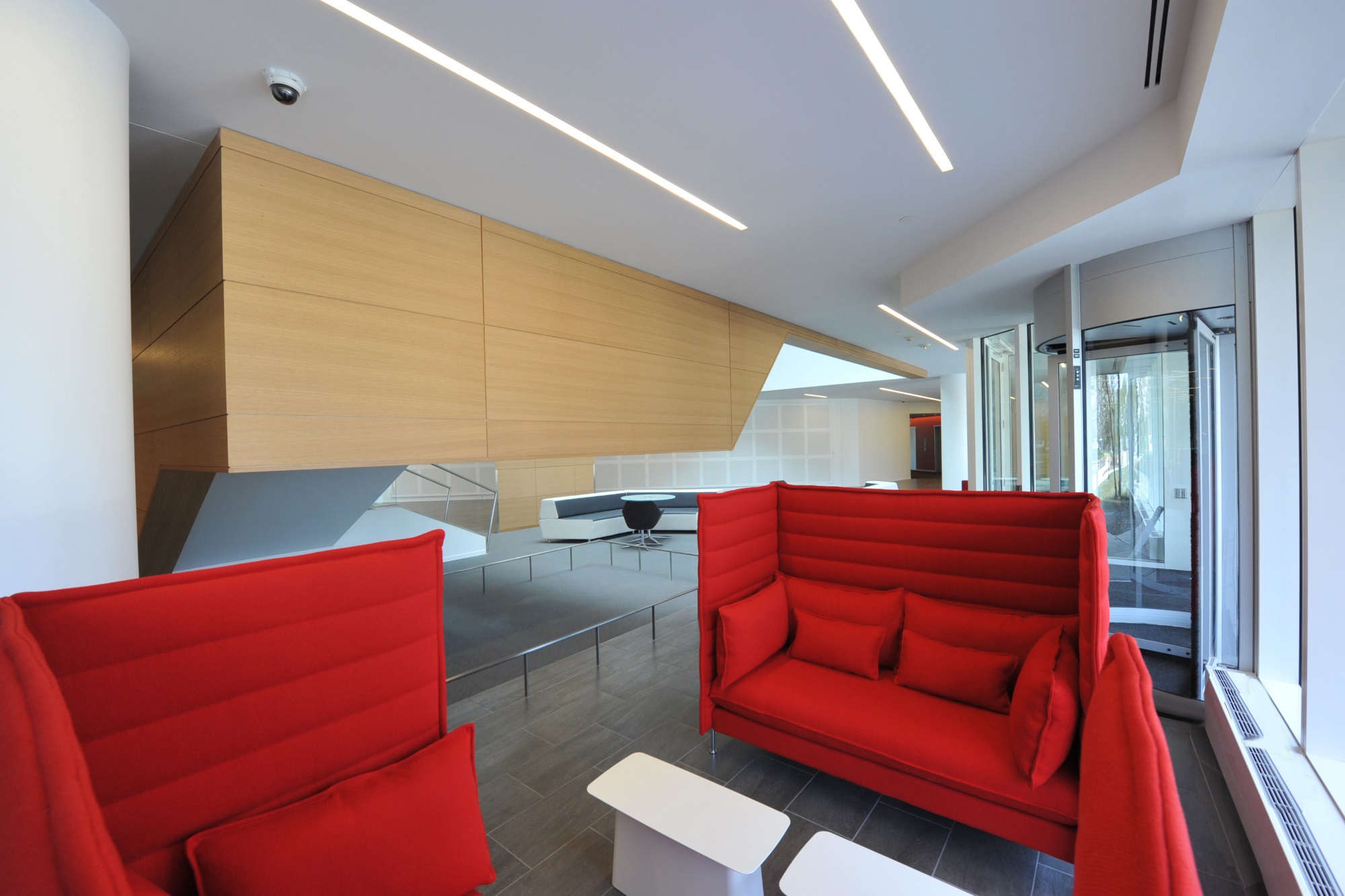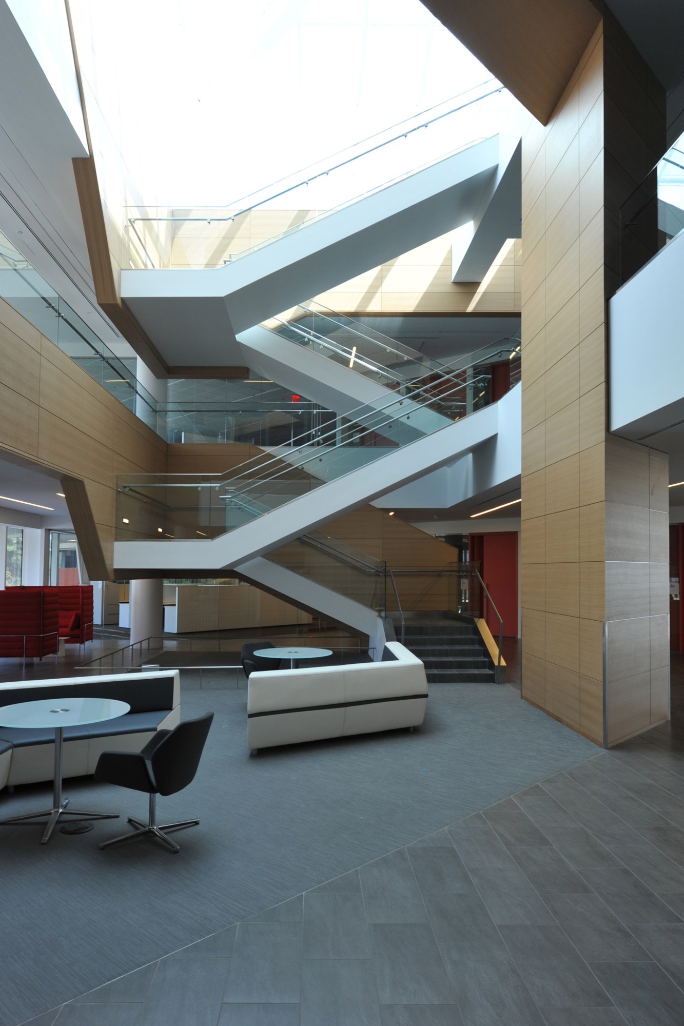 For this sophisticated new building in New Jersey, three staircases were clad with over 800 m² of AKUSTIpur wall panels. The carrier panels, made from MDF with fire protection class B-s2, d0 and formaldehyde-free adhesive, featured a veneered surface of American white oak. Given the complex shapes of these staircases, precise millimeter planning was impractical, making AKUSTIpur an ideal solution as a versatile, on-site adaptable panel. The fully microperforated panels were cut to size and finished with painted edges on-site, eliminating the need to account for unperforated edges during cutting and fastening. This approach minimized costs by avoiding factory fabrication of custom panels, reducing setup and travel requirements, and enabling a flexible, efficient, and cost-effective workflow.